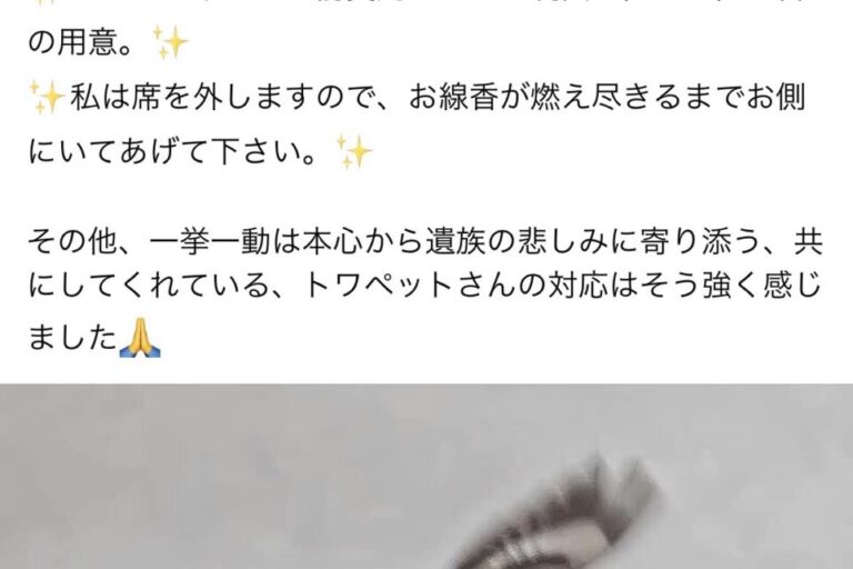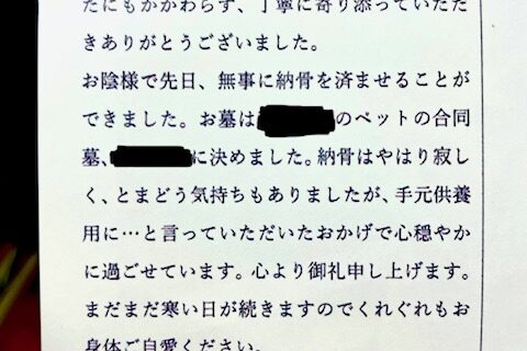 先日ご依頼頂いただきましたお客様からお手紙を頂きました。 ごご家族様、皆様で拾骨していただき ご家族様皆様本当に、お話ししやすく 優しさや温かみが滲み出てるようなご家族様でいらっしゃいました。 亡くなられたペットちゃんも…