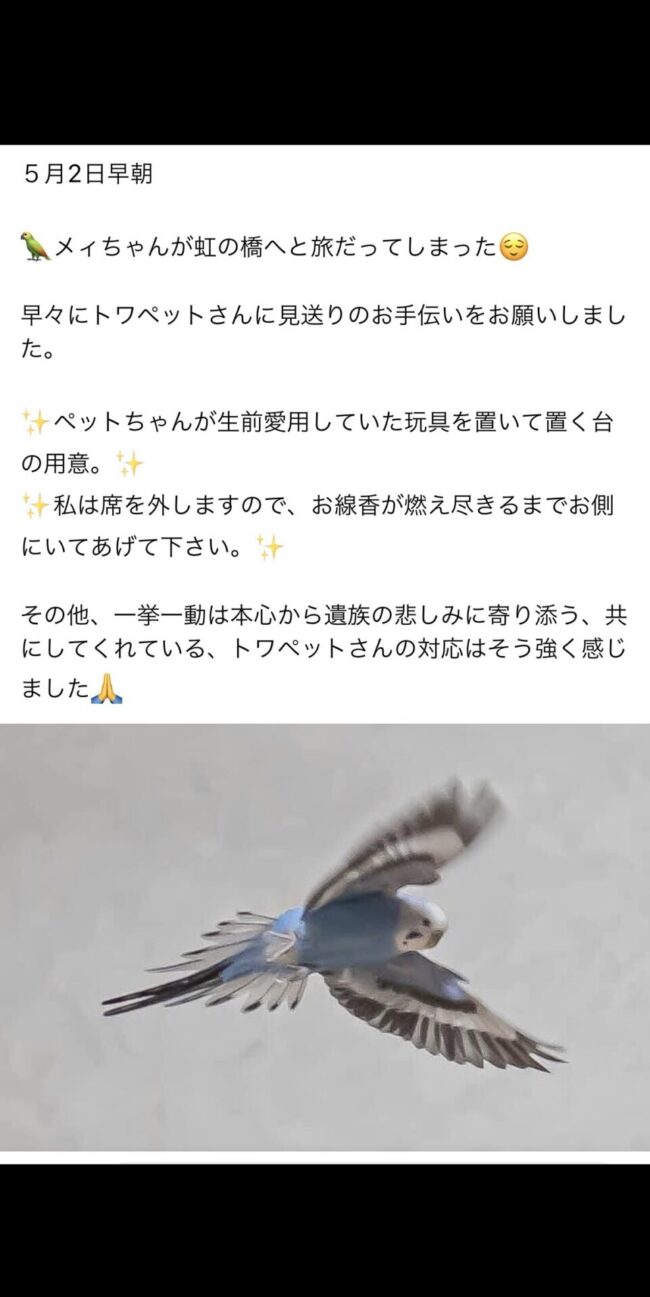 ご依頼者様からの声 ブログBy towapet2022年11月28日こんにちは!トワペットの高橋です 西多摩郡日の出町のU様がSNSに投稿してくださった当店のレビューを紹介したいと思います。 以下U様のSNSより抜粋 メィちゃんが虹の橋へと旅だってしまった😌 早々にトワペ…