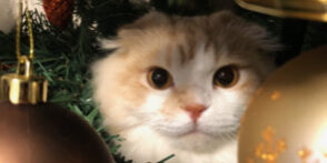 クリスマスツリーに隠れてこちらを伺っている、だいふく(スコティッシュフォールド)です。