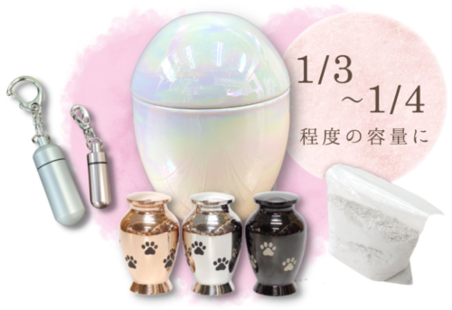 悲しみは簡単に癒えるものではございません。粉骨(パウダー加工)すれば、小さな骨壺やカプセルに入れて、いつも身近に感じられることでしょう。カプセルはペンダントのようにすることもできますので、生前のように一緒におでかけしても良いですね。大きな骨壺と違い、部屋を圧迫することもありません。