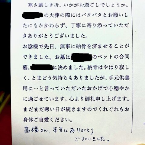 こんにちは。梅木です。 先日、火葬の一連の流れを高橋と一緒に執り行いました。 娘様がポロポロと涙をこぼしながら、火葬炉に愛犬を寝かし、手を合わせた瞬間に私もぶわっと来てしまい。。。 この仕事の一番つらい時です。 ご家族様…